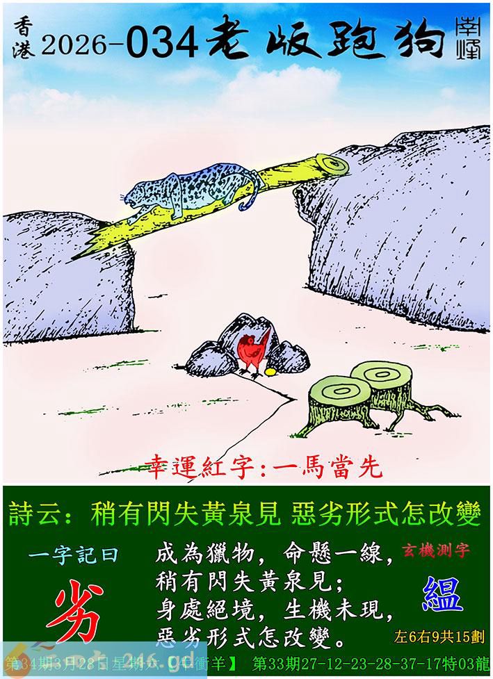 034期老版跑狗一字記之曰:【劣】 詩雲:稍有閃失黃泉見,惡劣形式怎改變。