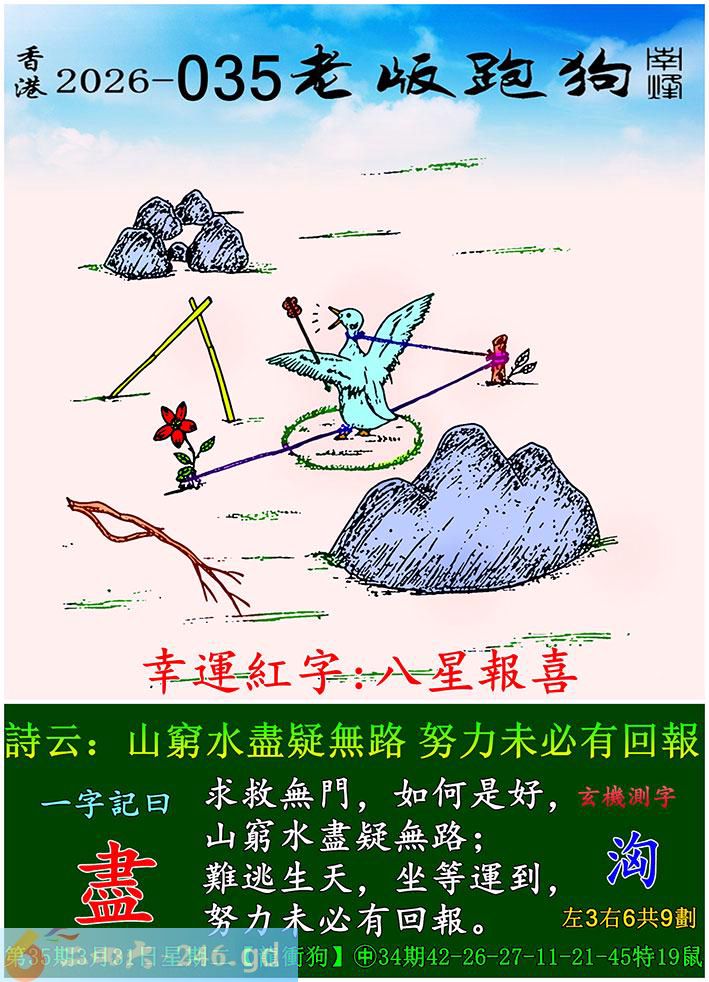 035期老版跑狗一字記之曰:【盡】 詩雲:山窮水盡疑無路,努力未必有回報。