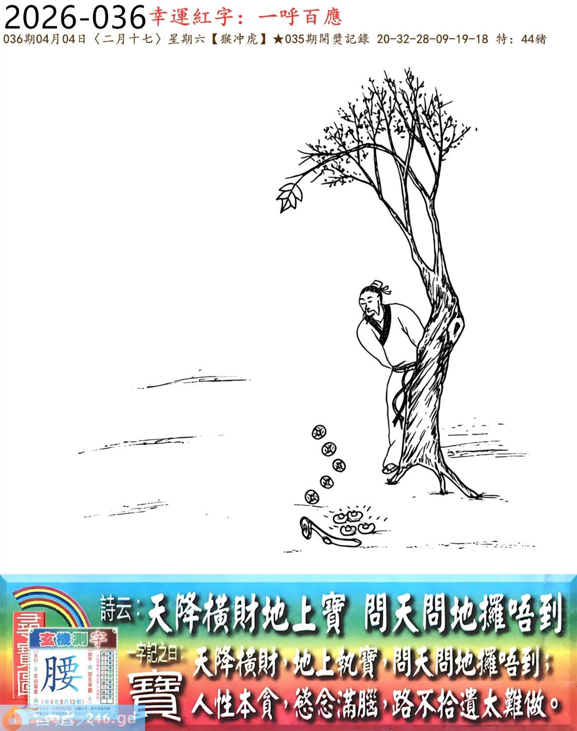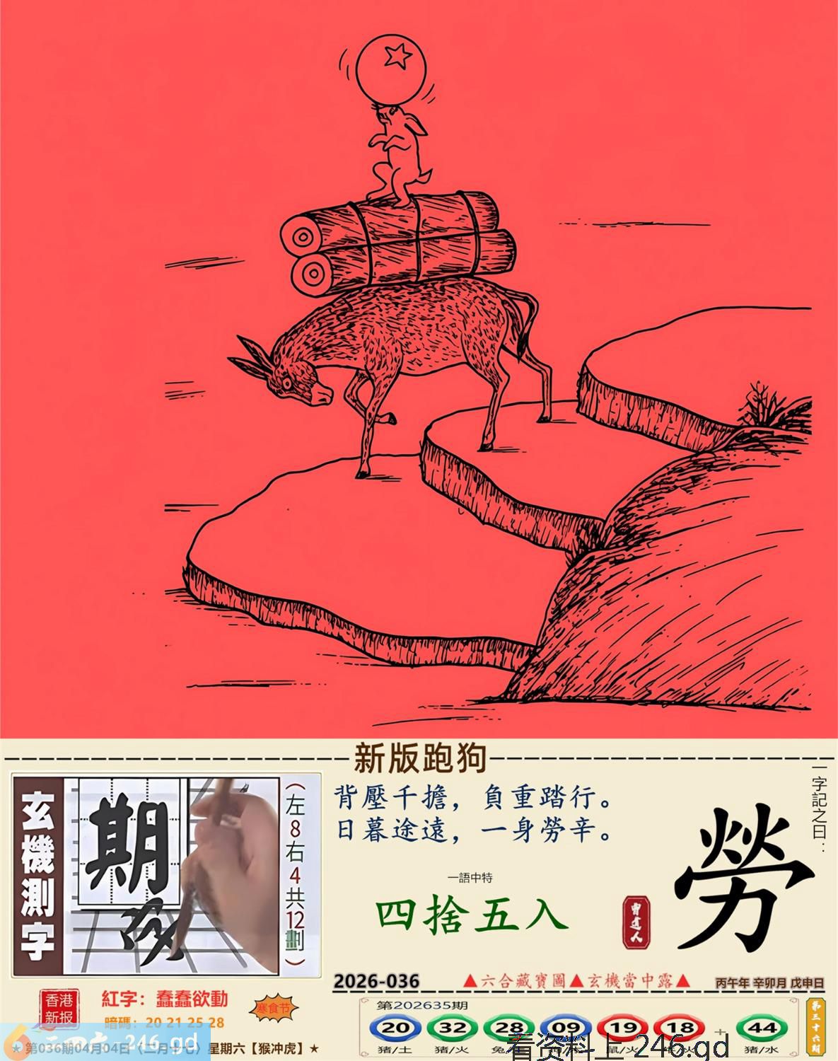 2026年4月4日二月十七星期六大驿土猴日冲虎 036期:老版跑狗玄機一字記之曰:【寶】 詩云:天降橫財地上寶,問天問地擺唔到。 天降橫財,地上執寶,問天問地擺唔到; 人性本貪,念滿腦,路不拾遺太難做。 玄機測字:《腰》 密圖詩:打開大門迎財神 記:八仙過海顯蛇兔 特碼大小單雙句:天涯海角 今期必中:劉協 036期:特碼歇后語 能字添四点-----熊样 036期正版四字梅花诗:四月四日。 036期火车头:烧伤马。诗:虎死鸡伤,三九看数一味真。 036期香港第一手欲钱料:闻鸡起舞。 036期曾道人说:“大?” 036期另版四字梅花诗:一个和尚。 036期香港第一手欲钱料:欲钱看脚小头大的动物。 036期曾道人说:“为什么女人疯狂的时候像头狼”? 036期二字经:绿红。 036期:五叶神是特码 036期智力金壤:天昏地暗 036期信箱紅字:【鍥而不舍】 036期【暗碼:16-19-20-47】 036期一語中特:【四捨五入】 發財玄機圖:交替運動節拍連續圖中明馬藍綠 036期:藏寳圖 新:西第将军成底事 老:剑花秋莲光出匣 禁:龙禁:2尾玄机字《部》 2026年036期【生活幽默】版 〖謹遵遺言的孩子〗 爺爺在病危之際,將年少無知的孫子叫到床前,用盡最後一口氣囑咐道:“孩子啊,這個世道......做官才好啊!” 小孫子是個聽話的孩子,他將爺爺臨終前的話牢牢記在心裏。許多年以後,他終于成了村裹最好的棺材匠。