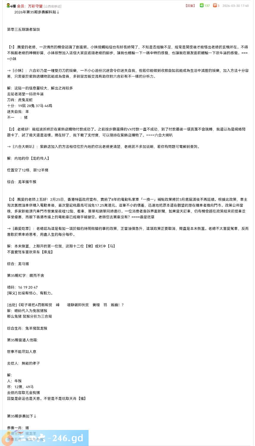 分享隔壁解料参赛区一个连中5期一肖中特的神人!神就神在发5期就中了5期一肖中特。解析的这3份料,尤其是他把六信红字释义结合4个暗码玩的出神入化。截图发贴分享是想六友学习学习思路,看自己往后的六合生涯能不能吸收运用了。