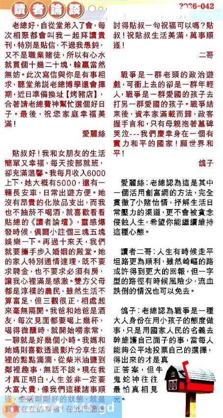【2】.貼叔好!我和女朋友的生活簡單又幸福,每天按部就班,卻充滿溫。我每月收入6000上下,她大概有5000,還有一輛長安車,日常出遊方便。她沒有昂貴的化妝品支出,而我也不抽菸不喝酒,就喜歡看看貼總的《讀者論壇》,靈感爆發時候,偶爾小注個三塊五塊娛樂一下。再過十來天,我們就要攜手步入婚姻的殿堂。她的家人特別通情達理,既不要求聘金,也不要求必須有房,讓我心裡滿是感激。雙方父母都是淳樸的農民,雖然生活不算富足,但三觀很正,相處起來毫無隔閡。我爸和她爸是酒友,每次見面都要喝上杯喝得微醺時,就開始嘮家常,一聊就是好幾個小時。我媽和她媽則喜歡透過影片分享生活裡的點點滴滴,從柴米油鹽到鄰裡趣事,無話不談。現在我才真正明白,人生並非一定要大富大貴,像我們這樣諸事順遂,生活剛剛好的狀態,就是實實在在的幸福!在此鬥膽想討得貼叔一句祝福可以嗎?貼叔!祝貼叔生活美滿,萬事順遂!二哥