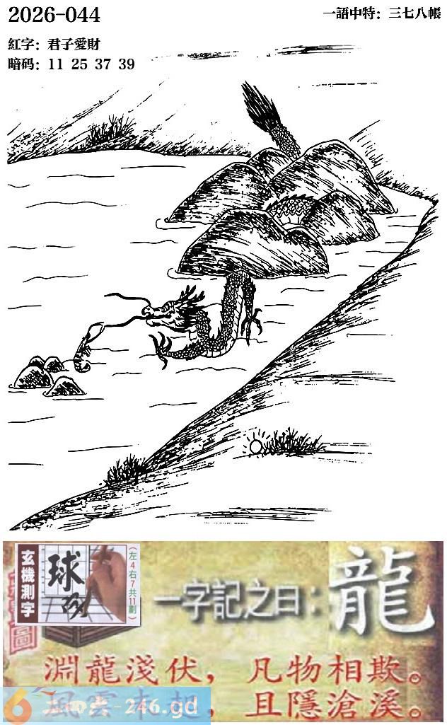 044期跑狗一字記之曰:【龍】 淵龍淺伏,凡物相欺。 風雲未起,且隱滄溪。 玄機測字:《球》 一語中特:三七八帳