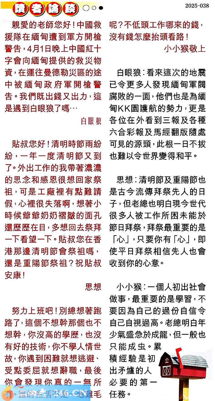 第零三八期讀者論談 1.親愛的老師您好!中國救援隊在緬甸遭到軍方開槍警告,4月1日晚上中國紅十字會向緬甸提供的救災物資,在運往曼德勒災區的途中被緬甸政府軍開槍警告。我們既出錢又出力,這是遇到白眼狼了嗎...白眼狼 〖白眼狼〗:看來這次的地震已令更多人發現緬甸軍閥腐敗的一面,他們也是為緬甸園護航的勢力,更是各位在外看到三報及各種六合彩報及馬經翻版隨處可見的源頭,此根一日不拔也難以令世界變得和平。 2.貼叔您好!清明時節雨紛紛,一年一度清明節又到了。外出工作的我帶著濃濃的思念和感恩很想回家祭祖,可是工廠裡有點難請假,心裡很失落啊,想著小時候爺爺奶奶褶皺的面孔還歷歷在目,多想回去祭拜一下看望一下。貼叔您在香港那邊清明節會祭祖嗎,還是重陽節祭祖?祝貼叔安康!思想 〖思想〗:清明節及重陽節也是古今流傳拜祭先人的日子,但老總也明白現今世代很多人被工作所困未能於節日拜祭,拜祭最重要的是「心」,只要你有「心」,即使平日拜祭相信先人也會收到你的心意。 3.努力上班吧!別總想著跑路了,這個不想幹那個也不想幹,你沒高的學歷,也沒有好的技術,你不學人情世故,你遇到困難就想逃避、受點委屈就想辭職,最後你會發現你真的一無所有。誰的生活不是一地雞毛呢?不低頭工作哪來的錢,沒有錢怎麼抬頭看路!小小猴敬上 〖小小猴〗:一個人初出社會做事,最重要的是學習,不.要因為自己的過份自信令自己自視過高。老總明白年少氣盛急於成龍,但一般也只能成虫。累積經驗是初出矛爐的人必要的第一任務。