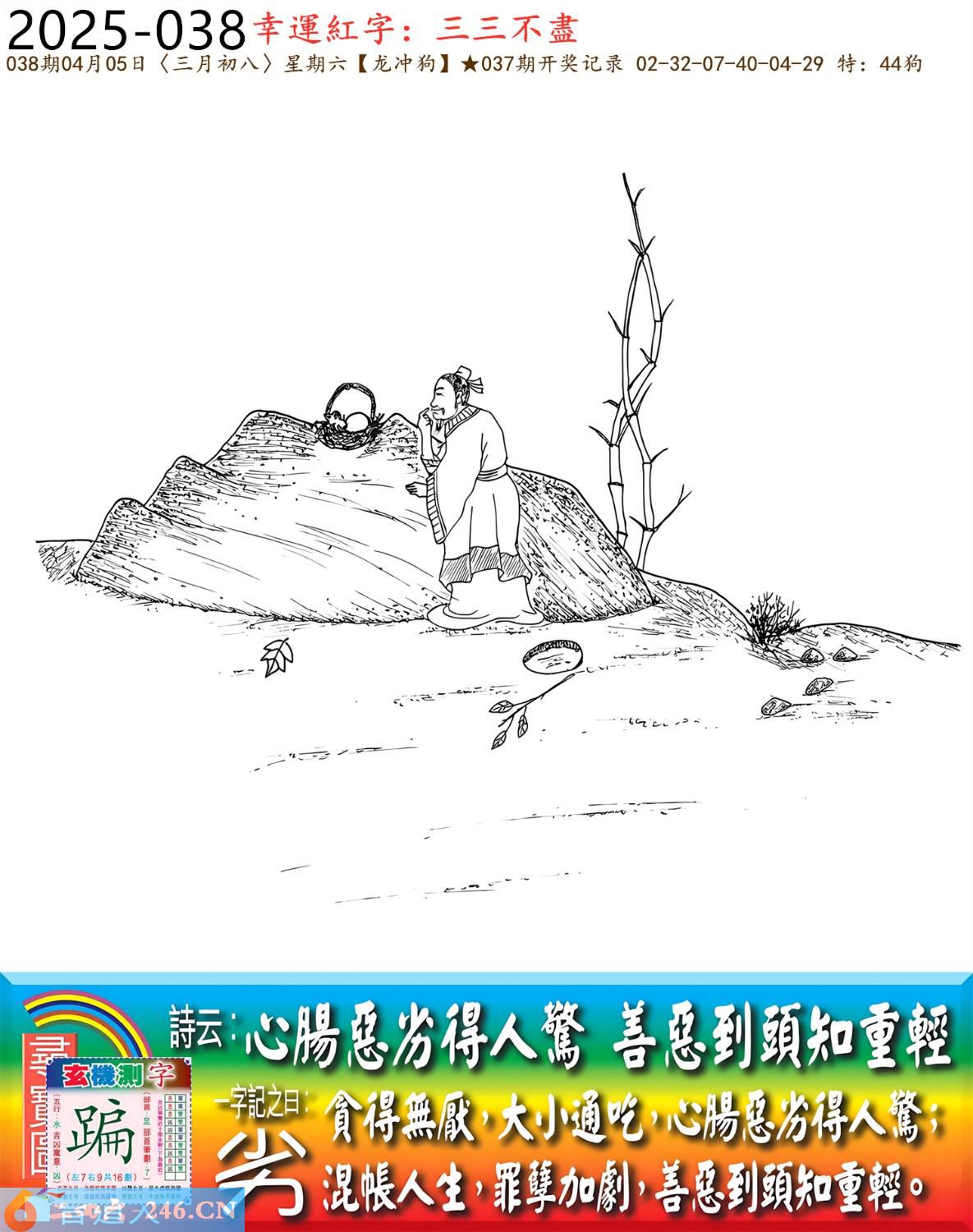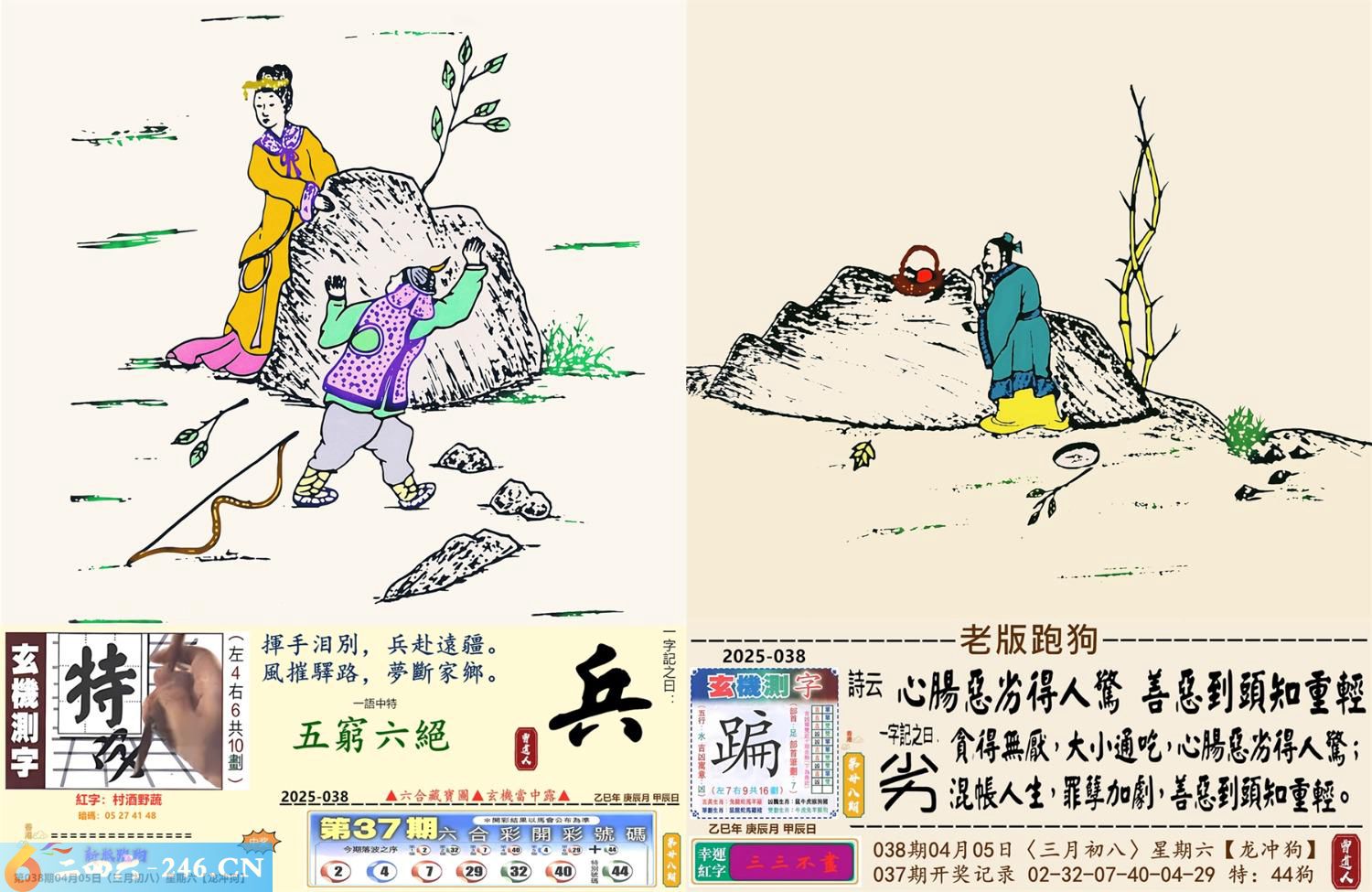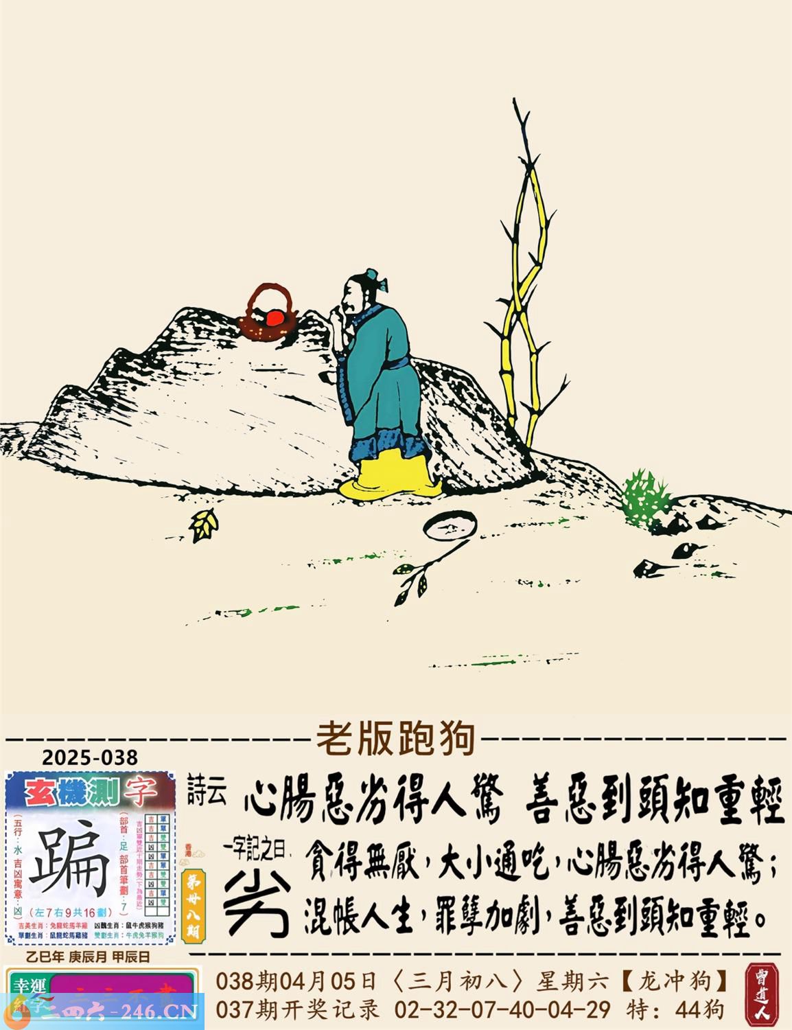 2025年4月5日038期狗(戊戌)(覆灯火) 038期:老版跑狗玄機一字記之曰:【劣】 詩云:心腸惡劣得人驚善惡到頭知重輕 貪得無厭,大小通吃,心腸惡劣得人驚; 混帳人生,罪孽加劇,善惡到頭知重輕。 玄機測字:《蹁》 密圖詩:一行文字二十四 《記》:七尺男兒當英雄 特碼大小單雙句:左右逢源一高人 今期必中:馬腾 038期:特碼歇后語 电视广告上的美人-----昙花一现 038期正版四字梅花诗:大腹便便。 038期火车头:烧伤鸡。诗:猴死狗伤,斑竹初成三妃庙。 038期香港第一手欲钱料:子。 038期曾道人说:“土?” 038期另版四字梅花:寻欢作乐。 038期香港第一手欲钱料:欲钱找伶俐头大的动物。 038期曾道人说:“为什么每个人都比较喜欢钱的背面呢”? 038期:二字經:登山 038期:北京有特码 038期:智力金壤: 038期:信箱紅字:【村酒野蔬】 038期:【暗碼:05-27-41-48】 038期:一語中特:【五窮六絕】 發財玄機圖:絕地翻身放任吃草圖中明牛藍綠 038期藏寶圖 新:却归前老更前身 老:西看窗日犹嫌短 禁:兔禁:0尾玄機字:《霓》 2025年038期【生活幽默】版 〖潜力〗 威爾遜先生决定做個小試驗,看看兒子長大後會成爲什麽樣的人。他在桌上放了三樣東西:一张10元的鈔票——一代表銀行家;一本嶄新的聖經一一一代表教士;還有一瓶威士忌——一代表二流子。然後,他躲在窗簾後面偷看。 兒子吹着口哨進來了,一眼看見桌上的東西,連忙四下張望,證實室内無人後,先把錢對着亮處照了照,然後翻了翻新聖經,接着打開瓶塞聞了一下,随即敏捷地一把抄起三樣東西,把錢塞進口袋,把酒瓶掖在胳肢育下,两手捧住聖經,吹着口哨走了。 威爾遜不禁鹜呼:“天哪!他要做公務員了!"