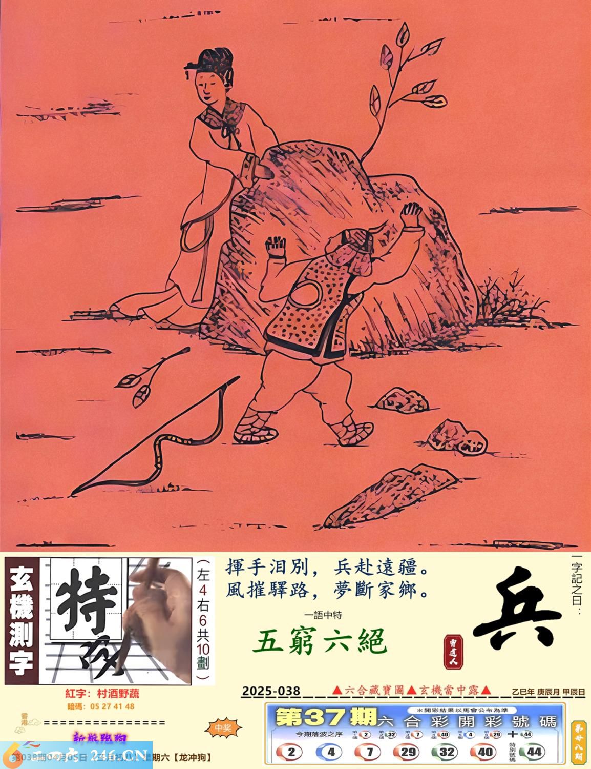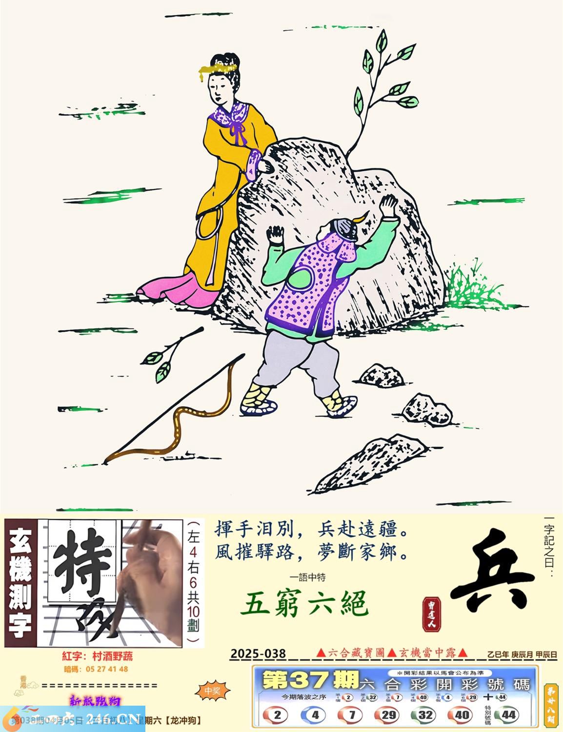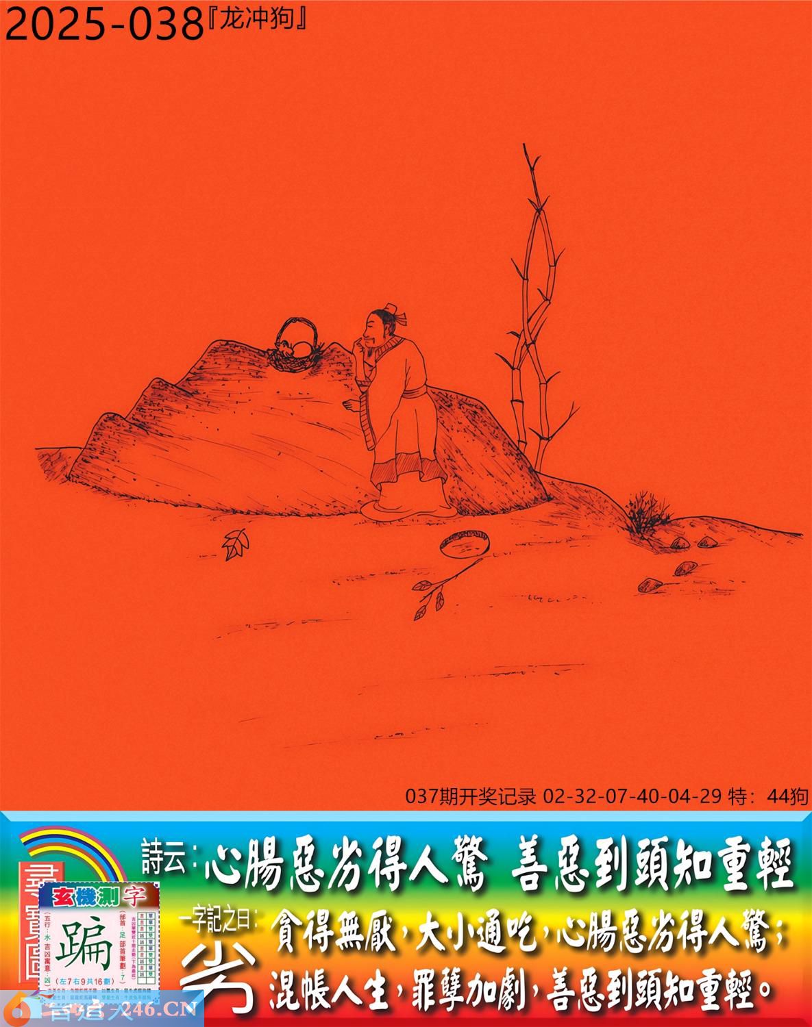 2025年4月5日038期狗(戊戌)(覆灯火) 038期:老版跑狗玄機一字記之曰:【劣】 詩云:心腸惡劣得人驚善惡到頭知重輕 貪得無厭,大小通吃,心腸惡劣得人驚; 混帳人生,罪孽加劇,善惡到頭知重輕。 玄機測字:《蹁》 密圖詩:一行文字二十四 《記》:七尺男兒當英雄 特碼大小單雙句:左右逢源一高人 今期必中:馬腾 038期:特碼歇后語 电视广告上的美人-----昙花一现 038期正版四字梅花诗:大腹便便。 038期火车头:烧伤鸡。诗:猴死狗伤,斑竹初成三妃庙。 038期香港第一手欲钱料:子。 038期曾道人说:“土?” 038期另版四字梅花:寻欢作乐。 038期香港第一手欲钱料:欲钱找伶俐头大的动物。 038期曾道人说:“为什么每个人都比较喜欢钱的背面呢”? 038期:二字經:登山 038期:北京有特码 038期:智力金壤: 038期:信箱紅字:【村酒野蔬】 038期:【暗碼:05-27-41-48】 038期:一語中特:【五窮六絕】 發財玄機圖:絕地翻身放任吃草圖中明牛藍綠 038期藏寶圖 新:却归前老更前身 老:西看窗日犹嫌短 禁:兔禁:0尾玄機字:《霓》 2025年038期【生活幽默】版 〖潜力〗 威爾遜先生决定做個小試驗,看看兒子長大後會成爲什麽樣的人。他在桌上放了三樣東西:一张10元的鈔票——一代表銀行家;一本嶄新的聖經一一一代表教士;還有一瓶威士忌——一代表二流子。然後,他躲在窗簾後面偷看。 兒子吹着口哨進來了,一眼看見桌上的東西,連忙四下張望,證實室内無人後,先把錢對着亮處照了照,然後翻了翻新聖經,接着打開瓶塞聞了一下,随即敏捷地一把抄起三樣東西,把錢塞進口袋,把酒瓶掖在胳肢育下,两手捧住聖經,吹着口哨走了。 威爾遜不禁鹜呼:“天哪!他要做公務員了!"