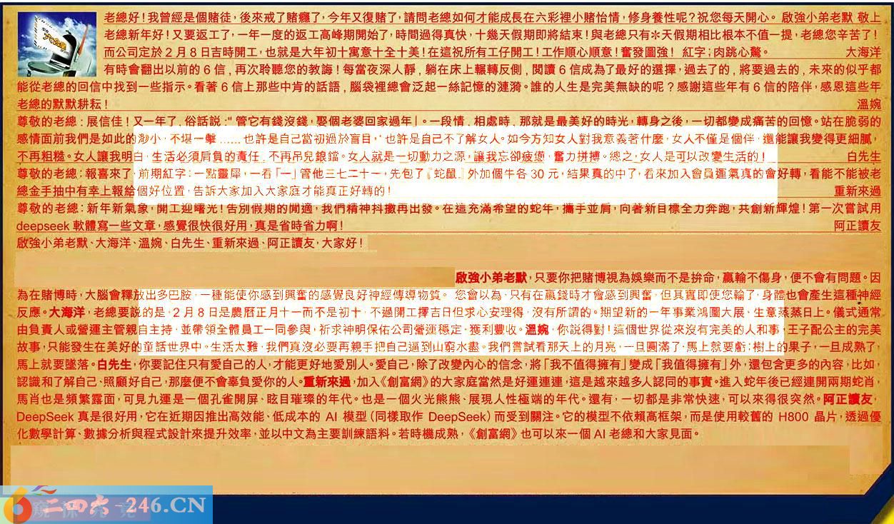 第022期《六合皇信箱文字版》10000%正確!!!正版二四六論壇*精心製作!!! 啟強小弟老默、大海洋、溫婉、白先生、重新來過、阿正讀友,大家好! 【1】.老總好!我曾經是個賭徒,後來戒了賭癮了,今年又復赌了,請問老總如何才能成長在六彩裡小賭怡情,修身養性呢?祝您每天開心。啟強小弟老默敬上 〖啟強小弟老默〗:只要你把賭博視為娛樂而不是拚命,贏輸不傷身,便不會有問題。因為在賭博時,大腦會釋放出多巴胺,一種能使你感到興奮的感覺良好神經傳導物質。您會以為,只有在贏錢時才會感到興奮,但其實即使您輸了,身體也會產生這種神經反應。 【2】.老總新年好!又要返工了,一年一度的返工高峰期開始了,時間過得真快,十幾天假期即將結束!與老總只有*天假期相比根本不值一提,老總您辛苦了!而公司定於2月8日吉時開工,也就是大年初十寓意十全十美!在這祝所有工仔開工!工作順心順意!奮發圖強!紅字肉跳心驚。大海洋 〖大海洋〗:老總要說的是,2月8日是農曆正月十一而不是初十,不過開工擇吉日但求心安理得,沒有所謂的。期望新的一年事業鴻圖大展,生意蒸蒸日上。儀式通常由负責人或營運主管親自主持,並帶領全體員工一同參與,祈求神明保佑公司營運穩定獲利豐收。 【3】.有時會翻出以前的6信,再次聆聽您的教誨!每當夜深人靜,躺在床上輾轉反側,閱讀6信成為了最好的選擇,過去了的,將要過去的,未來的似乎都能從老總的回信中找到一些指示。看著6信上那些中肯的話語,腦袋裡總會泛起一絲記憶的漣漪。誰的人生是完美無缺的呢?感謝這些年有6信的陪伴,感恩這些年老總的默默耕耘!溫婉 〖溫婉〗:你說得對!這個世界從來沒有完美的人和事,王子配公主的完美故事,只能發生在美好的童話世界中。生活太難,我們真沒必要再親手把自己逼到山窮水盡。我們嘗試看那天上的月亮旦圆滿了,馬上就要虧;樹上的果子,一旦成熟了,馬上就要墜落。 【4】.尊敬的老總:展信!又一年了,俗話說:"管它有錢沒錢,娶個老婆回家過年」。一段情,相處時,那就是最美好的時光,轉身之後,一切都變成痛苦的回憶。站在脆弱的感情面前我們是如此的渺小,不堪一擊......也許是自己當初過於盲目,也許是自己不了解女人。如今方知女人對我意義著什麼,女人不僅是個伴,還能讓我變得更細膩,不再粗糙。女人讓我明白,生活必須局負的責任,不再吊兒鋃鐺。女人就是一切動力之源,讓我忘卻疲憊,奮力拼搏。總之,女人是可以改變生活的!白先生 〖白先生〗:你要記住只有愛自己的人,才能更好地愛別人。愛自己,除了改變內心的信念,將「我不值得擁有」變成「我值得擁有」外,還包含更多的內容,比如,認識和了解自己、照顧好自己,那麼便不會辜負愛你的人。 【5】.尊敬的老總:報喜來了,前期紅字:一點發犀一看「一」管他三七二十一,先包了「蛇鼠」外加個牛各30元結果的中了,看來加入會員運氣真的會好轉,看能不能被老總金手抽中有幸上報給個好位置,告訴大家加入大家庭才能真正好轉的!重新來過 〖重新來過〗:加入《創富網》的大家庭當然是好運連連,這是越來越多人認同的事實。進入蛇年後已經連開兩期蛇肖、馬肖也是頻繁露面,可見九運是一個孔雀開屏、眩目璀璨的年代。也是一個火光熊熊、展現人性極端的年代。還有,一切都是非常快速,可以來得很突然。 【6】.尊敬的老總:新年新氣象,開工迎曙光!告別假期的閒適,我們精神抖擻再出發。在這充滿希望的蛇年,攜手並肩,向著新目標全力奔跑,共創新輝煌!第一次嘗試用軟體寫一些文章,感覺很快很好用,真是省時省力啊!阿正讀友 〖阿正讀友〗:真是很好用,它在近期因推出高效能、低成本的模型(同樣取作)而受到關注。它的模型不依賴高框架,而是使用較舊的800晶片,透過優化數學計算、數據分析與程式設計來提升效率,並以中文為主要訓練語料。若時機成熟,《創富網》也可以來個老總和大家見面。 紅字:窺探究竟 暗码:19253642 [释义]指暗中察看并探索事物的真相或本质。